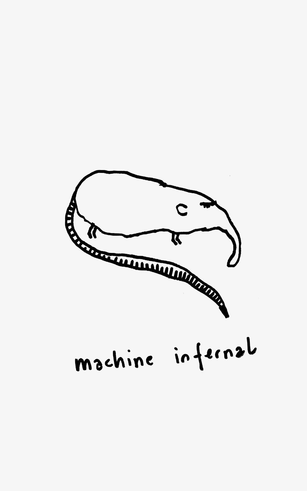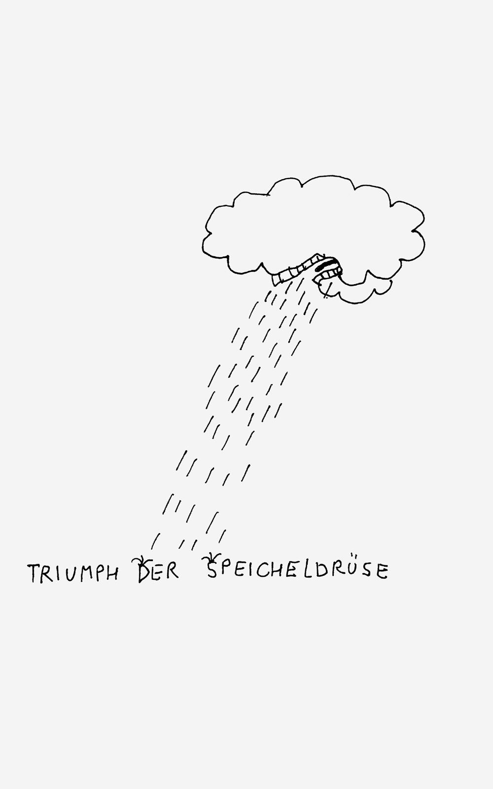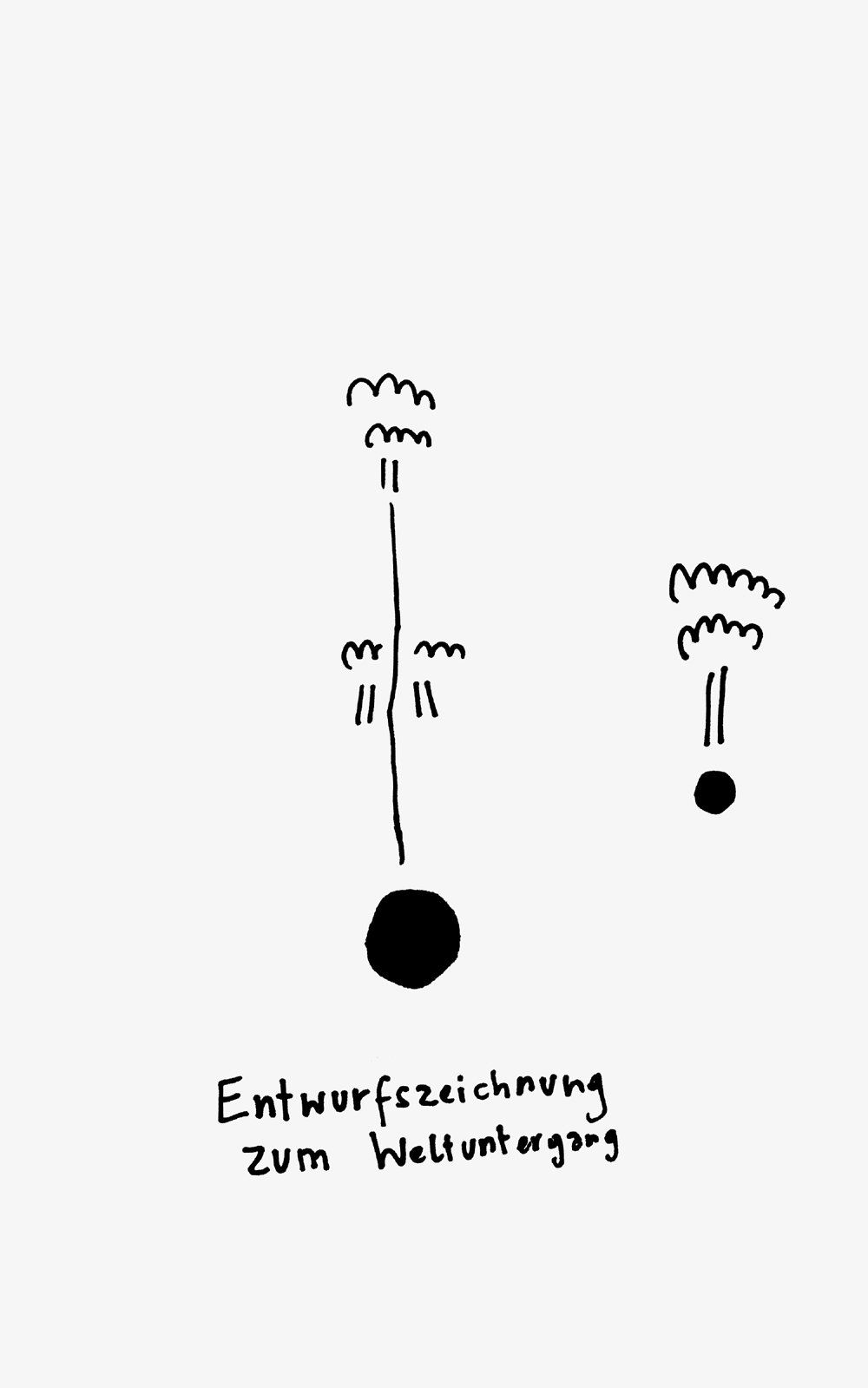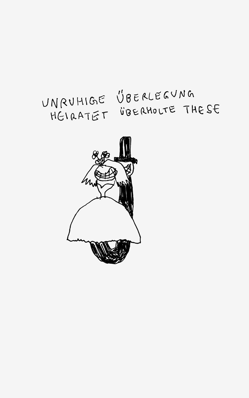 This book brings together a series of drawings that each represent a brief engagement with the possible psychological strain experienced by individuals in a civilised society. Ontological, political, economic and ecological issues are packaged in darkly comic drawings and interrogated using wordplay, cross-references and commentaries. The final product offers a pessimistic outlook that invites the reader to join in on the joke, and at the same time is based on the synergistic effects of spontaneous drawings and reflective textual commentary. The contents of the pages in the book were mostly drawn using marker pen and fineliner before being scanned and assembled into a digital collage. Selected drawings were enlarged to A4 and A3 format, printed and framed.