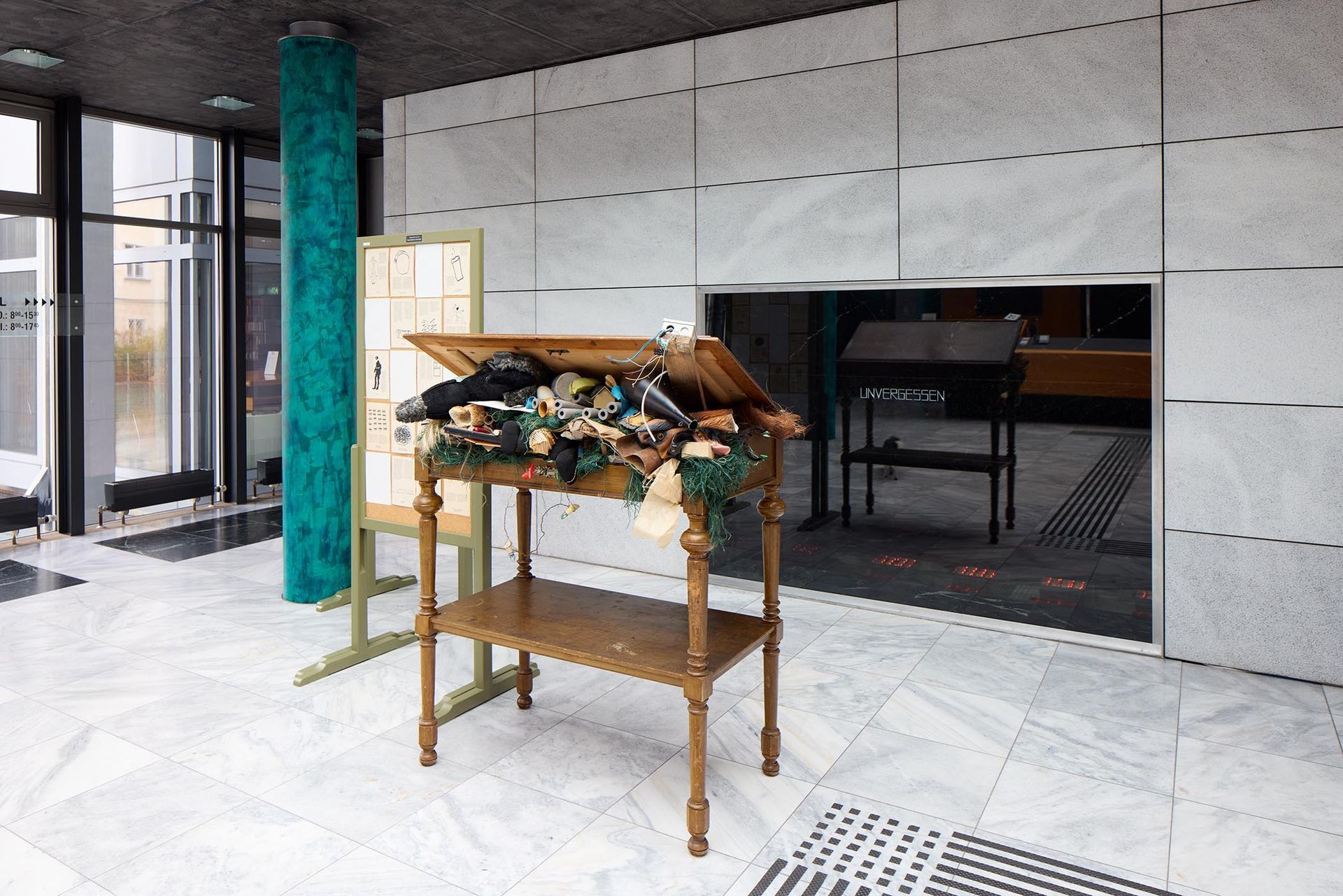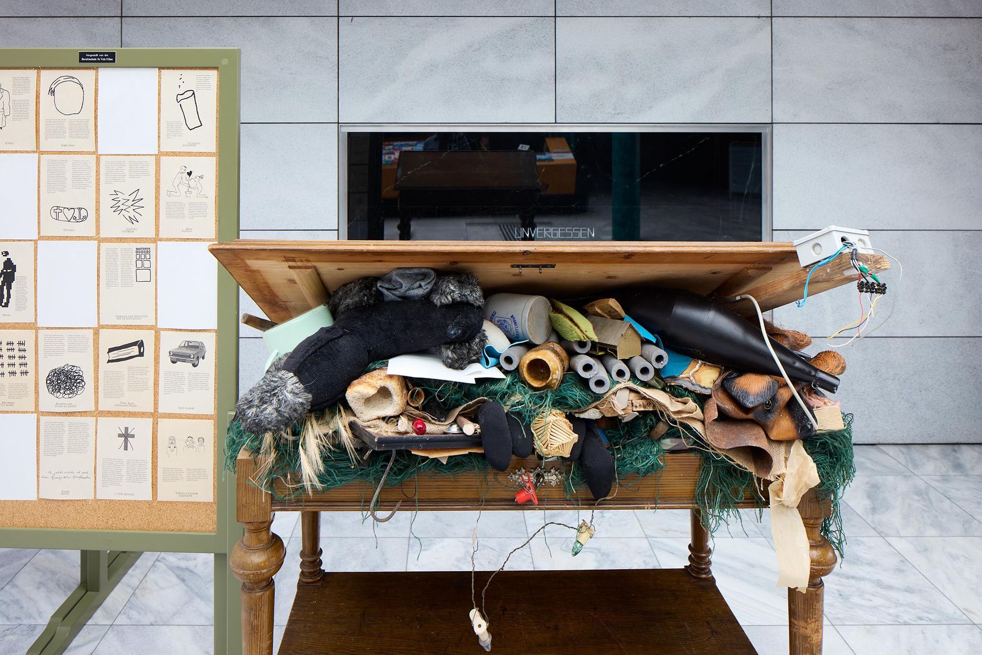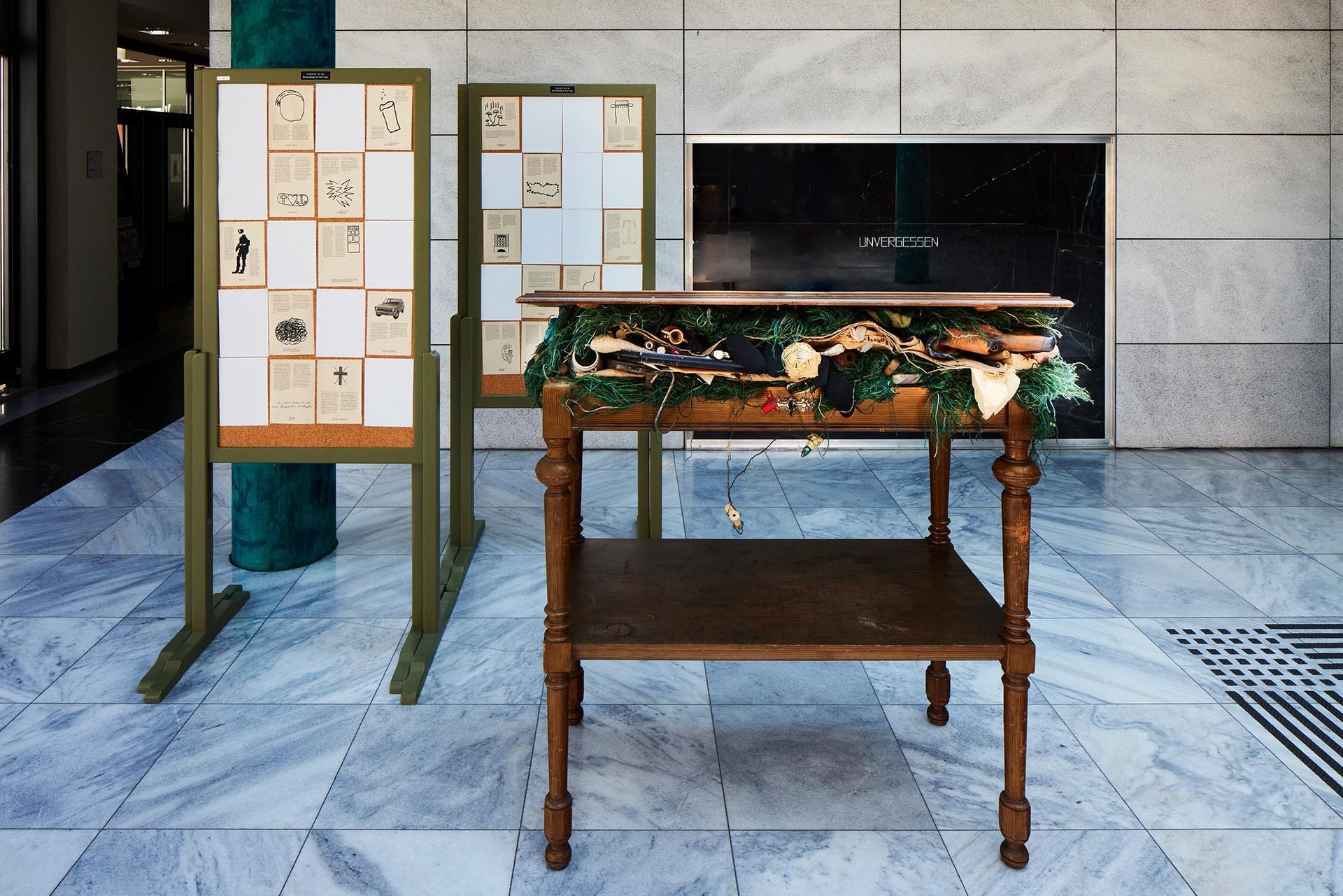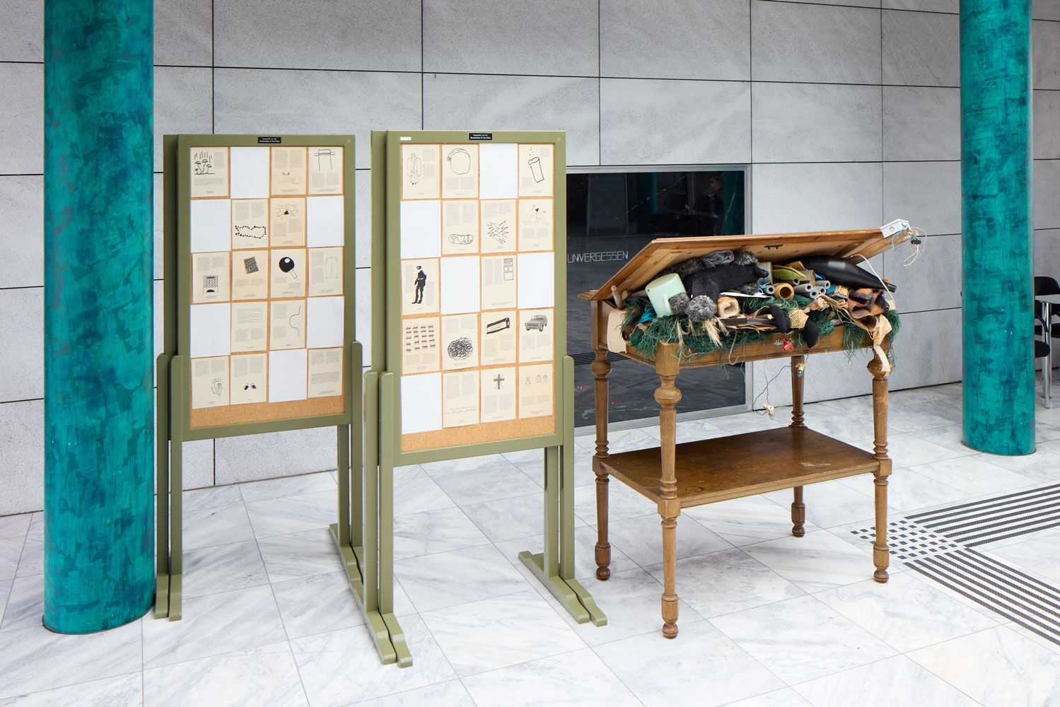 In her drawings, she records the research process, and over the course of several months her presentation in the Kärntner Landesarchiv becomes increasingly dense. Everyday fragments spilling out of an old archive secretary suggest that what has been repressed cannot remain hidden forever. In close proximity to Cornelius Kolig’s permanent installation Unvergessen