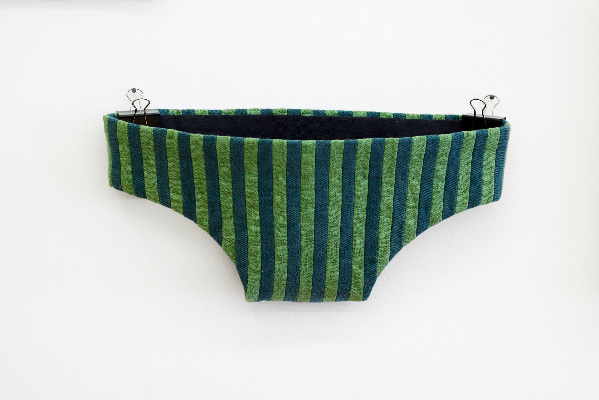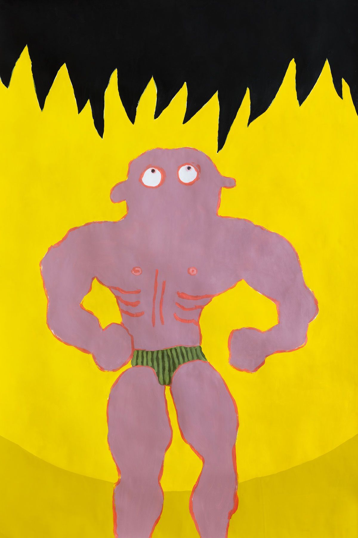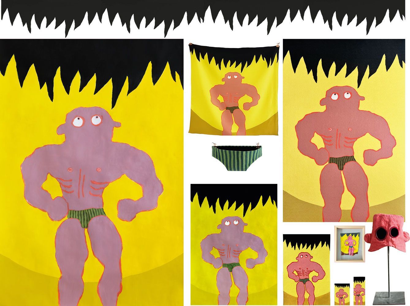 consists of an “original” — a gouache painting depicting a stylized, muscular figure — several reproductions of the motif on various objects, as well as items that incorporate elements from the painting: drinking bottles, tea cups, bedside rugs, scarves, poster prints, and erasers in small editions; a garland, a pair of underpants, a wrestling mask, and more.