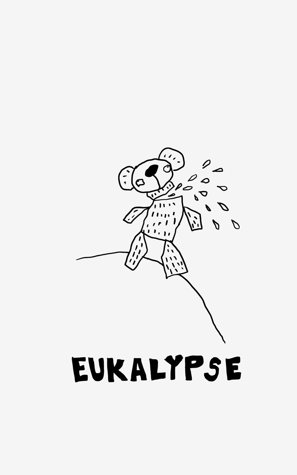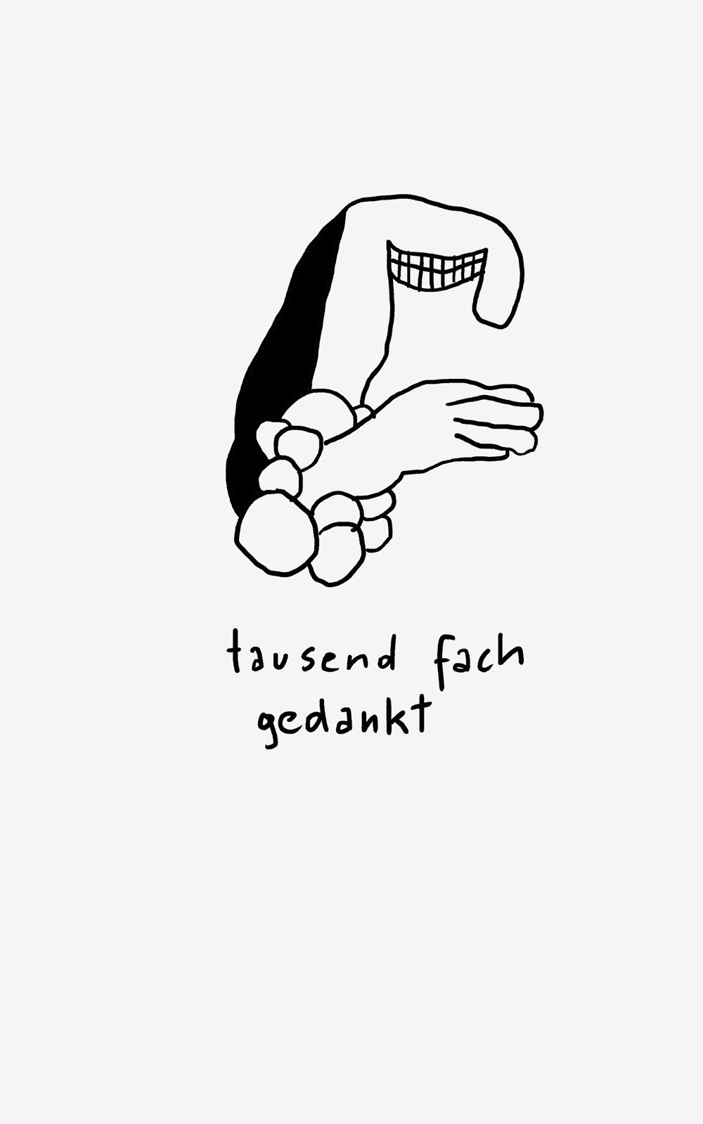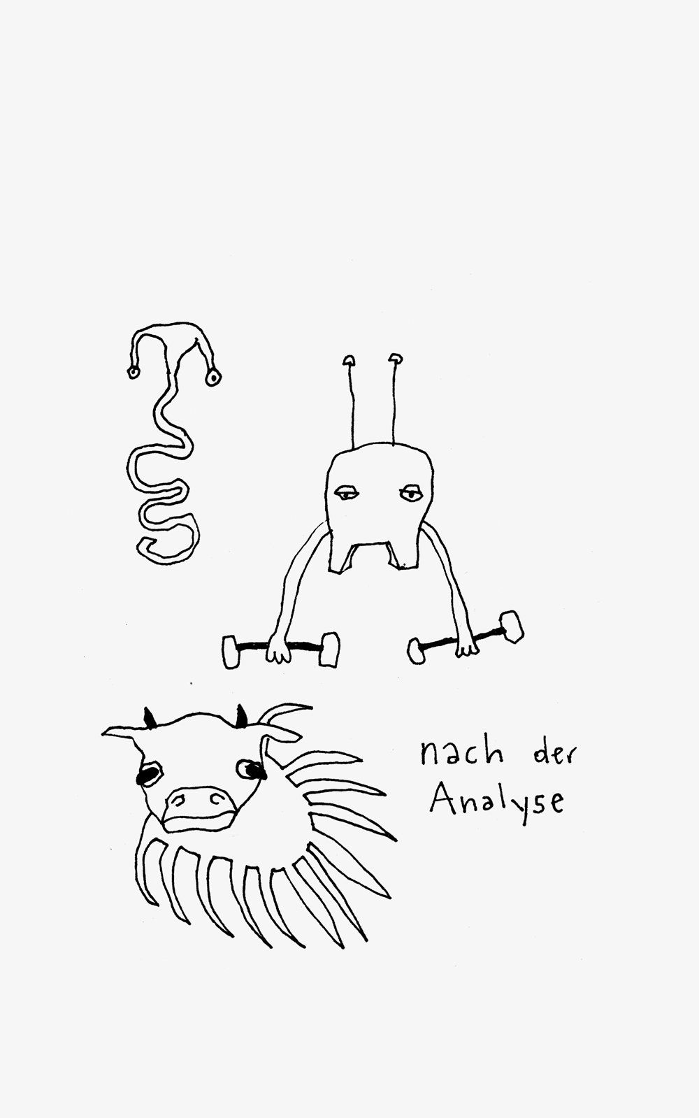This book brings together a series of drawings that each represent a brief engagement with the possible psychological strain experienced by individuals in a civilised society. Ontological, political, economic and ecological issues are packaged in darkly comic drawings and interrogated using wordplay, cross-references and commentaries. The final product offers a pessimistic outlook that invites the reader to join in on the joke, and at the same time is based on the synergistic effects of spontaneous drawings and reflective textual commentary. The contents of the pages in the book were mostly drawn using marker pen and fineliner before being scanned and assembled into a digital collage.
