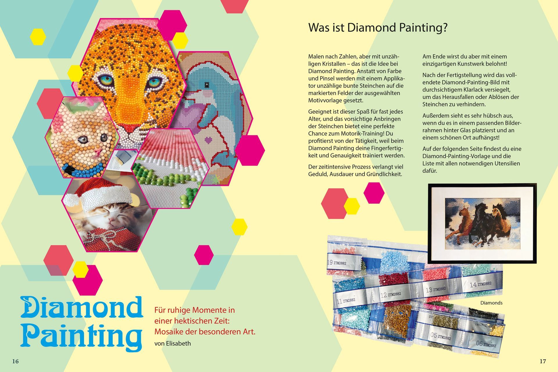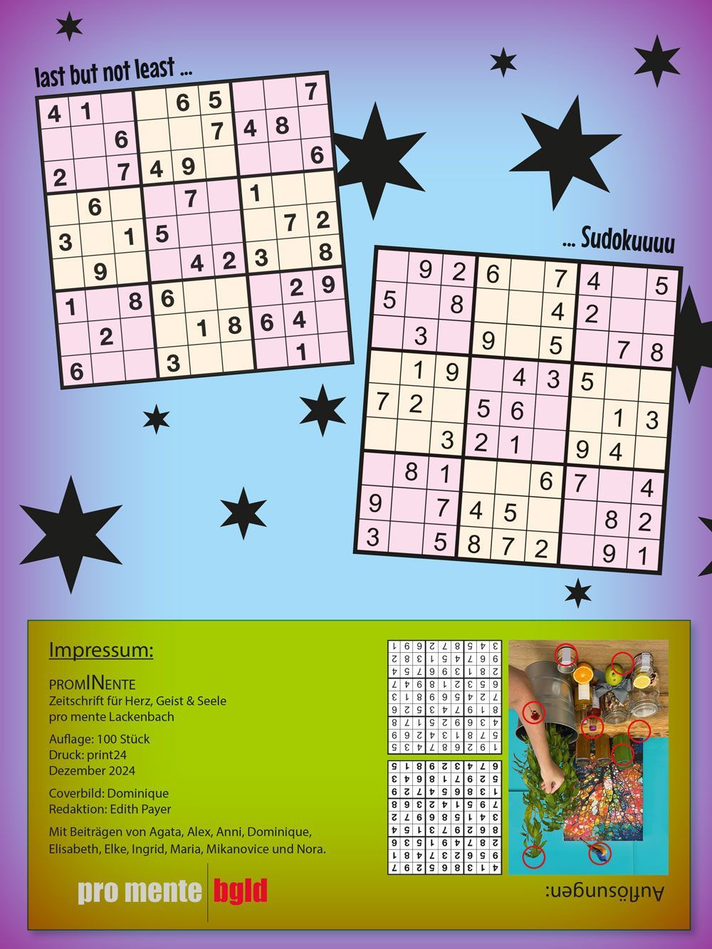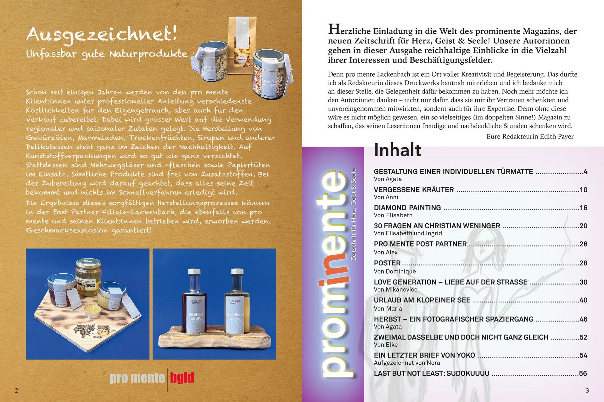 The PromInente magazine was created as part of a multi-month workshop series for and with the clients of pro mente Lackenbach. The jointly developed glossy magazine includes numerous contributions that provide insight into their interests and hobbies, as well as their everyday lives. Photographs, stories, diamond painting, herbal studies, and much more found a place in the 56-page publication, which was printed in an edition of 100 copies.