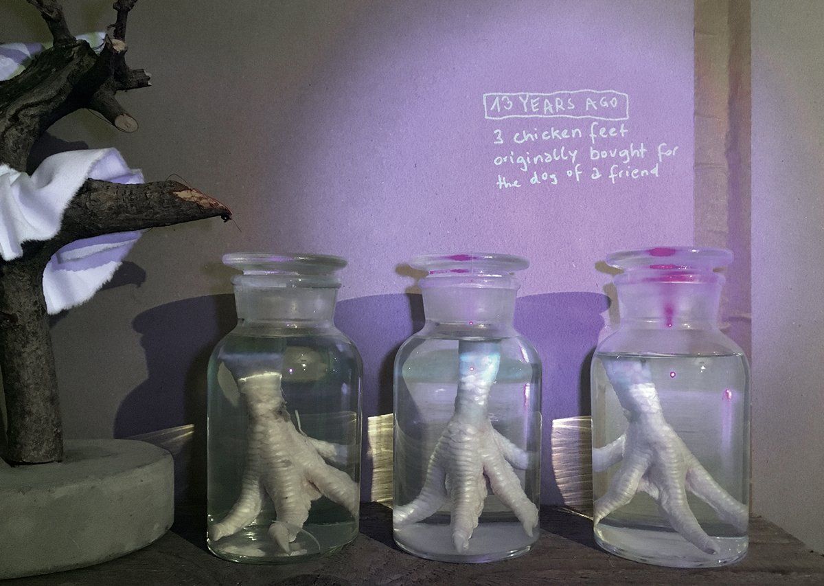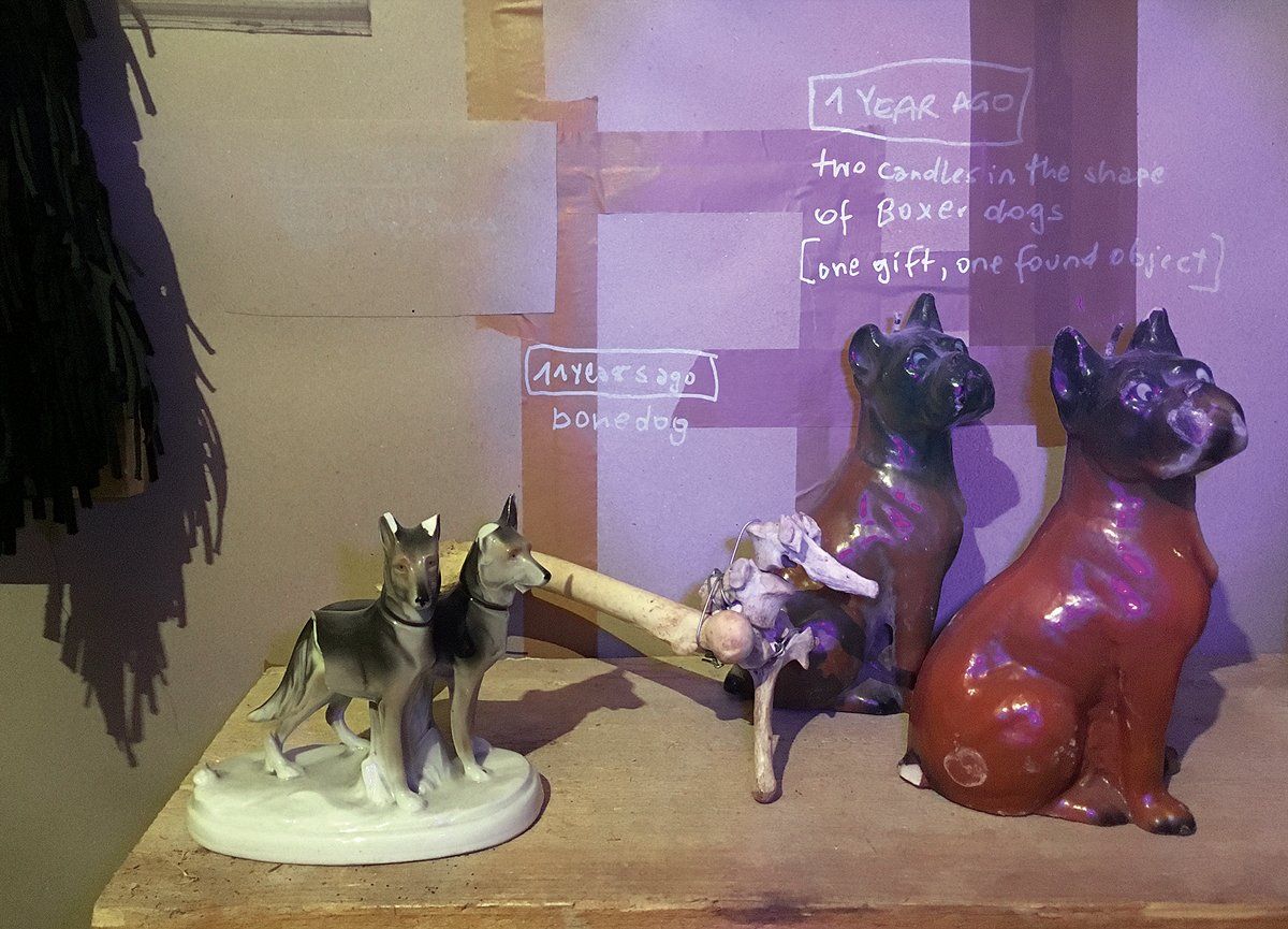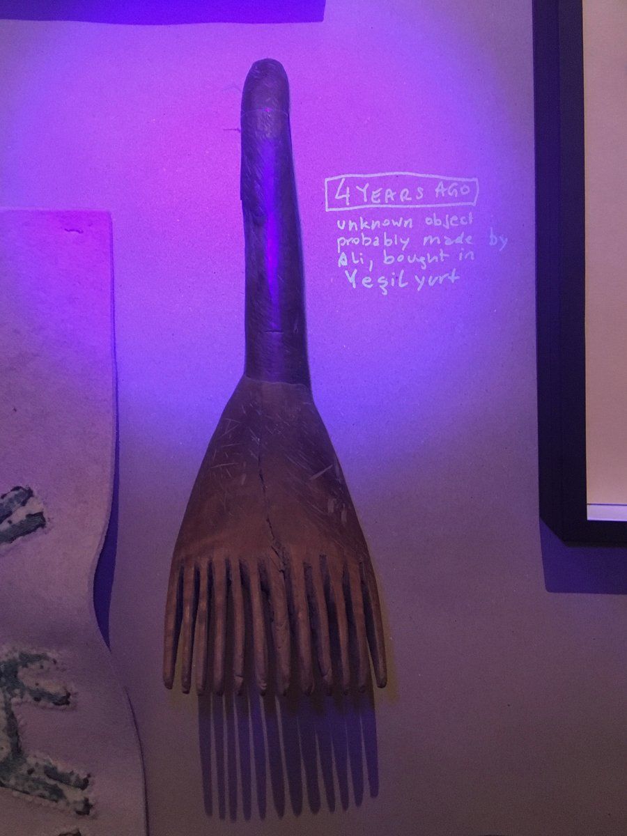 Labels offer visitors detailed information about the individual objects, but these cannot be seen when viewing the piece as a whole; they can only be read one by one with the help of the UV torches provided. The chronological information provided about the objects is deictic, so that its meaning shifts depending on when the visitor views the installation.