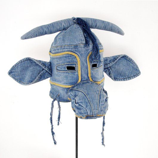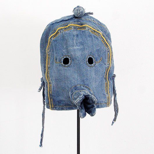 Despite fierce resistance from different organizations and a diplomatic intervention, in 2013 two famous Parisian auction houses publicly sold over one hundred Native American masks. Most of these were Katsinam masks belonging to the Hopi, a tribe from Arizona. The mere depiction of these cult objects in an auction catalogue represents a huge insult to their traditions. This work developed from an engagement with those depictions as an ambivalent act aiming to produce profane works of art. A selection of nine Katsinam figures were reproduced in denim, rendered with a “used look”, and then exhibited on stands of varying height, similarly to how they were displayed in the auction houses.