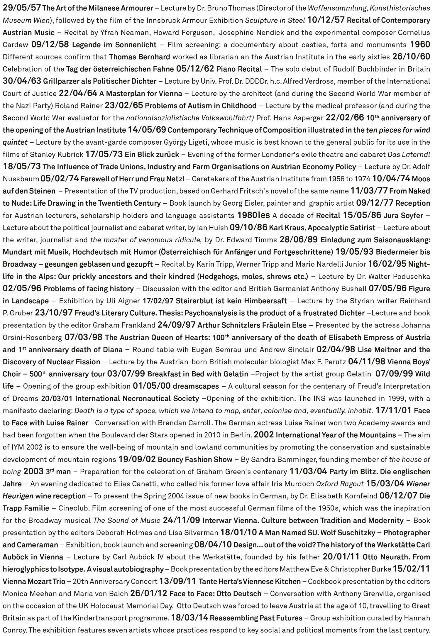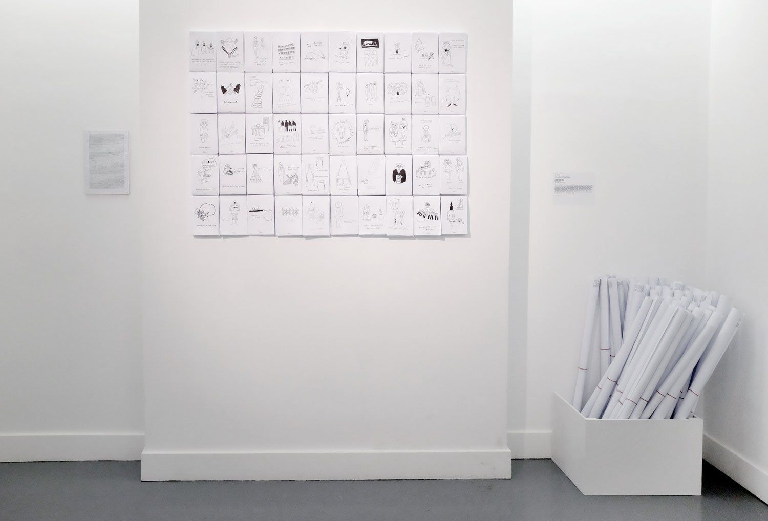 „turning pages“ was created for the exhibition Out of the Box, curated by section.a, to mark the 60th anniversary of the Austrian Cultural Forum in London. The work comprises an illustrated representation of the history of the events held by the Forum. The 50 individual drawings were created based on research undertaken in the documentation archive of the ACF and refer in various ways to selected events and thematic areas. At the same time, they address not only the Forum’s extensive events program, but also its unique features in terms of content – and it was possible to identify certain shifts in priorities within that program over the decades. The individual drawings were digitally compiled onto a single printed sheet in A0 format. For the installation, 50 of these posters were folded in such a way that a different one of the individual drawings was displayed on top of each poster. An accompanying text was also published alongside the limited-edition posters, which listed the selected events on which the installation was based.